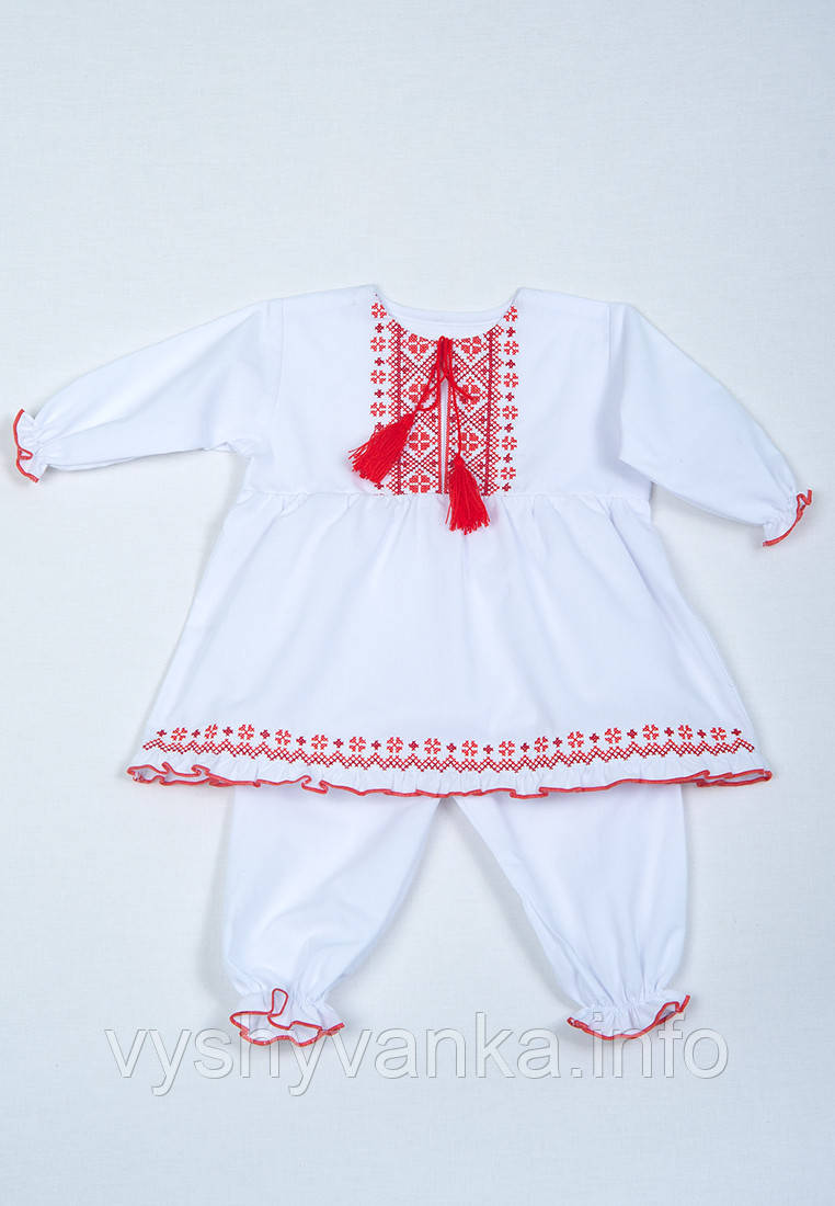 Одяг для хрещення для новонародженої включає в себе платтячко-вишиванку і штанці.